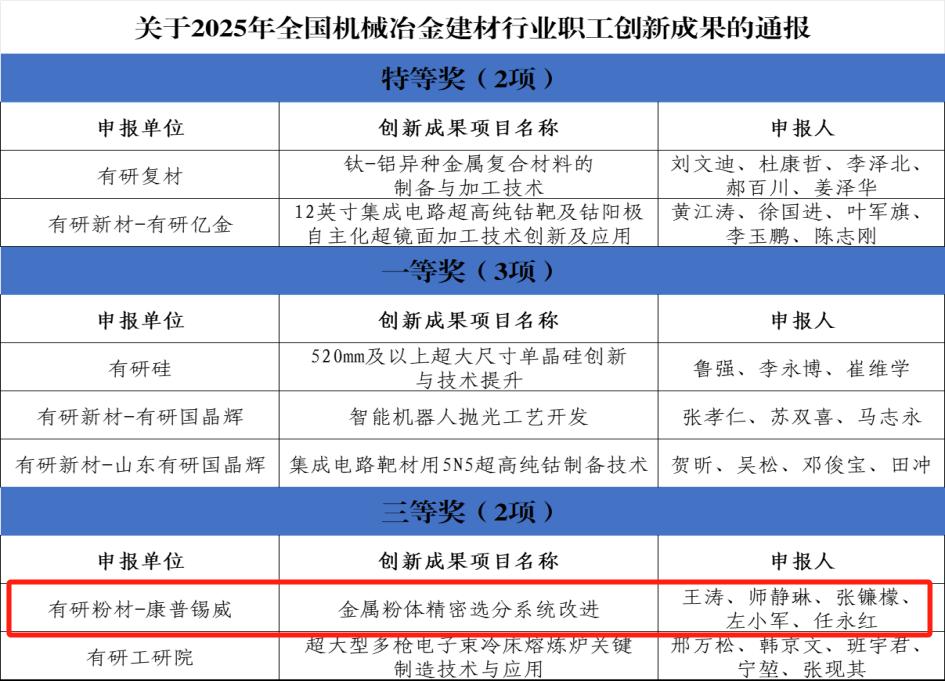 近日,2025年全国机械冶金建材行业职工创新成果评选结果揭晓,有研粉材申报的创新成果《金属粉体精密选分系统改进》荣获三等奖,在守正创新中展现出新作为。